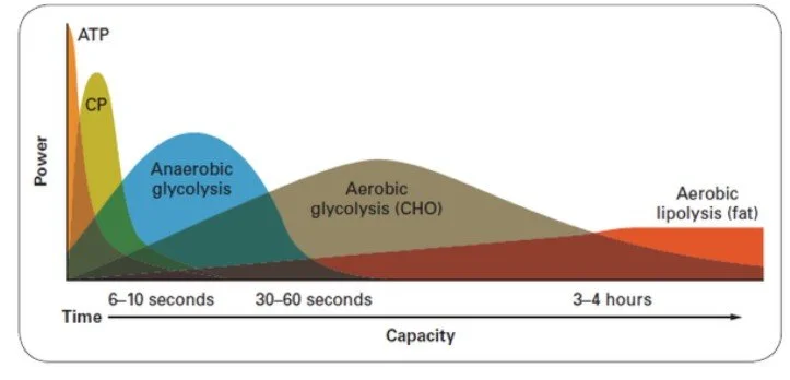 Moving forward we see the peak in contribution of anaerobic glycolysis. Glycolysis or carbohydrate (glucose) metabolism is a great source of high energy very quickly. This is why we see higher peaks for output. The initial breaking of glucose does not require oxygen and is very fast, 100 times faster than aerobic metabolism. On the other hand we only gain 2 ATP molecules of the 36 total that can be gathered through aerobic metabolism. The downside of this fast energy extraction is that the remaining product, pyruvate, will pool and become lactate. This is not sustainable. Further aerobic contribution increases as we move into longer durations. These processes are slower, but contribute much more energy. This is for all energy sources primarily glucose and fat. The takeaway is that there is no point at which all energy comes from one source. All sources contribute at all intensities while their relative contribution will vary based on time and intensity as more energy dense pathways take time to provide the ATP needed for exercise.